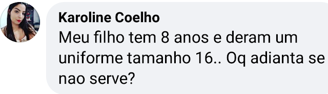 uniforme tamanho 16”, relata Karoline Coelho. A costura da camiseta foi citada:
