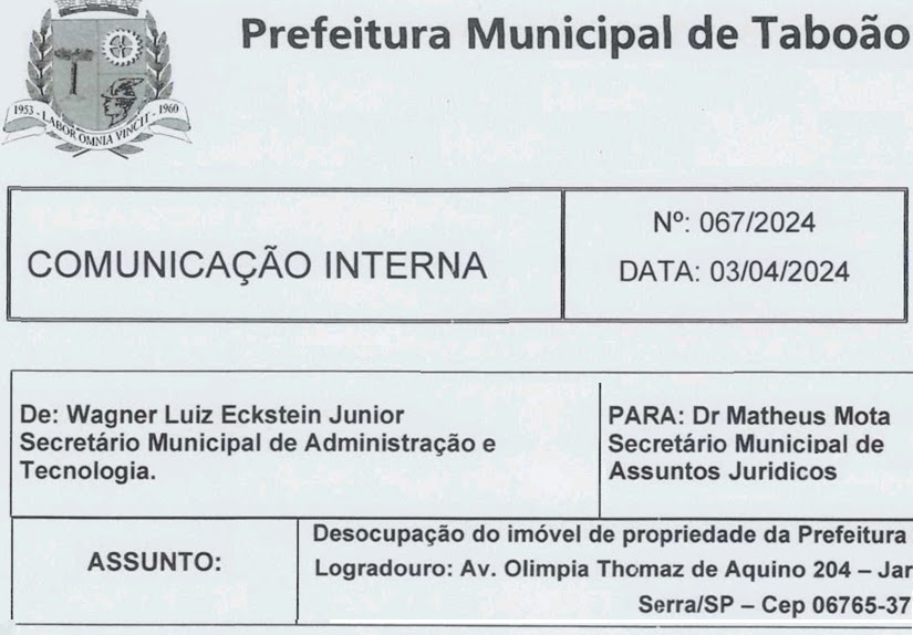 2ª-feira (15), a Prefeitura de Taboão da Serra foi notificada oficialmente da